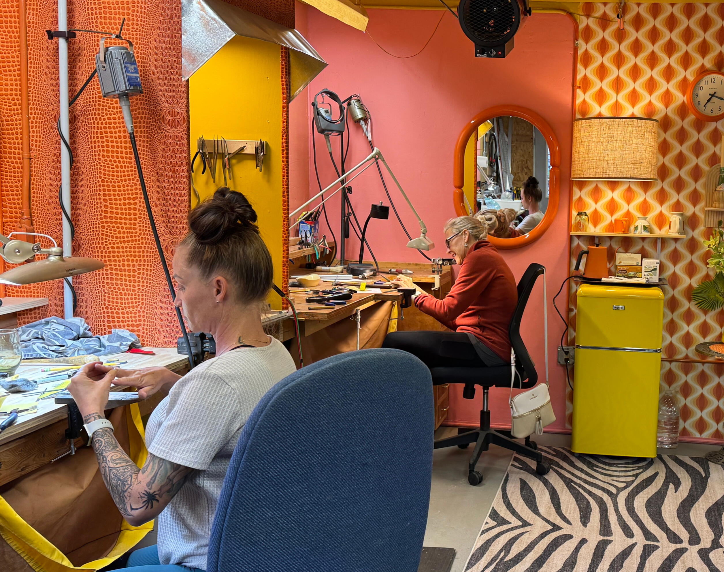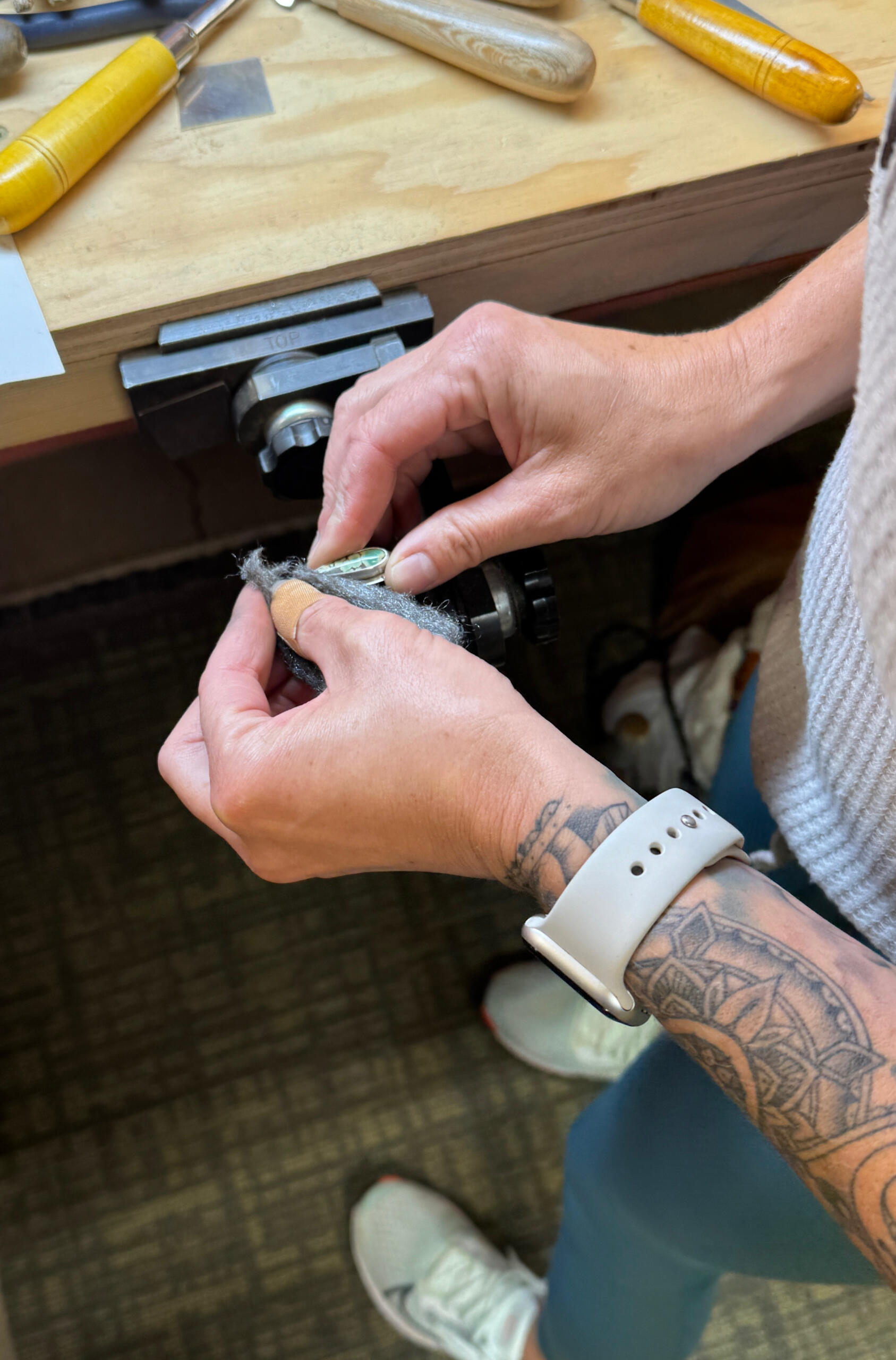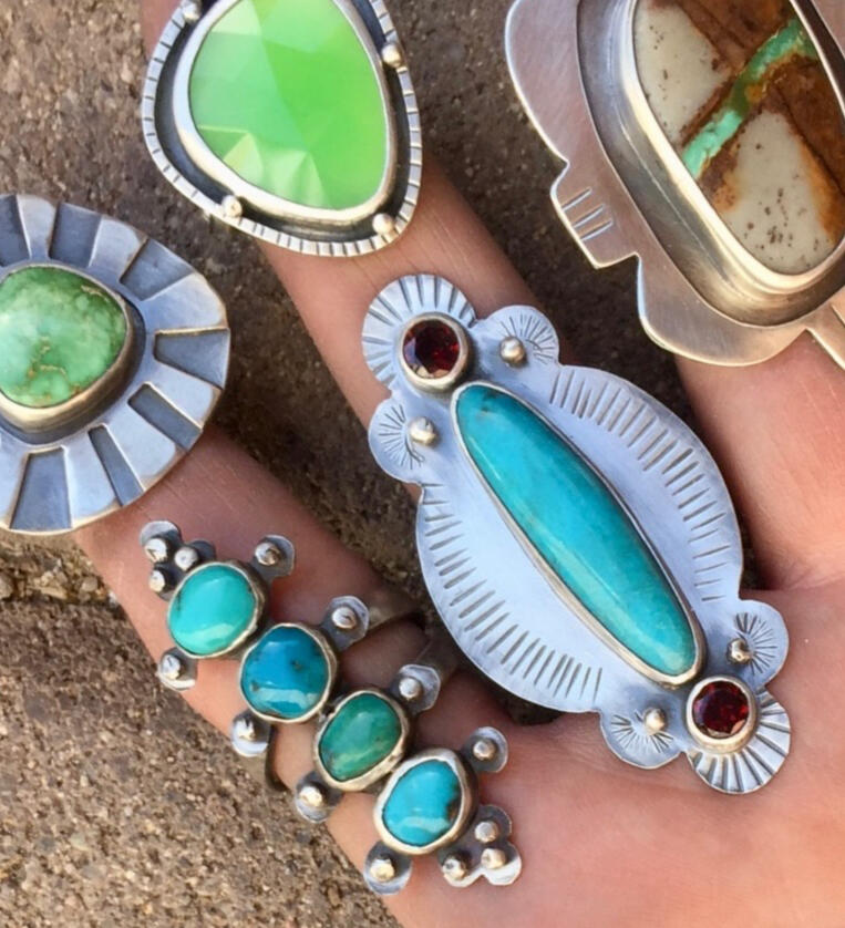 My studio is a well equipped space. It has a hip vibe and is located in the gulch district of Bisbee a block down from all the bars and restaurants. Small class size 4 students per class allowing individual attention. Each student has their own workbench, flex shaft, hand tools, etc. There is a soldering station with ventilation. There is an anvil with loads of hammers, stamps and other forming tools. I have an amazing collection of gemstones for you to choose from for your project.