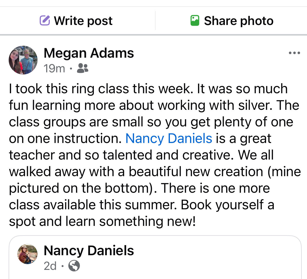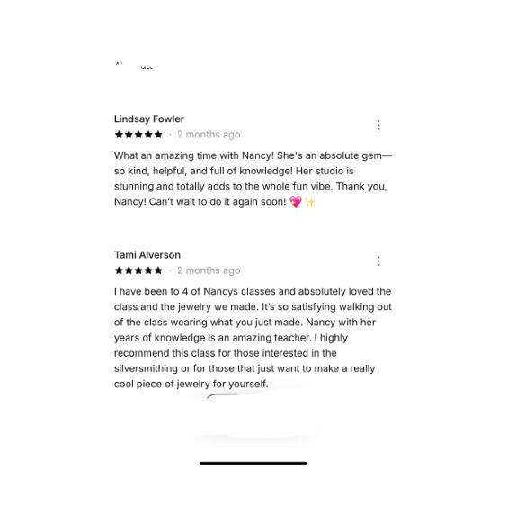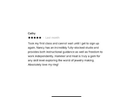 Thanks to Nancy's instruction, I now have a one-of-a-kind ring, my name hand stamped under its bridge, made by me for me, and I wear it every day. Nancy's expertise with silversmithing is a true gift and she is so generous with the knowledge she's gained over decades of experience. One of the things I love most is she speaks to me like I have all the potential in the world as a silversmith. I can't wait to take more classes at Hammer and Heat. Beth